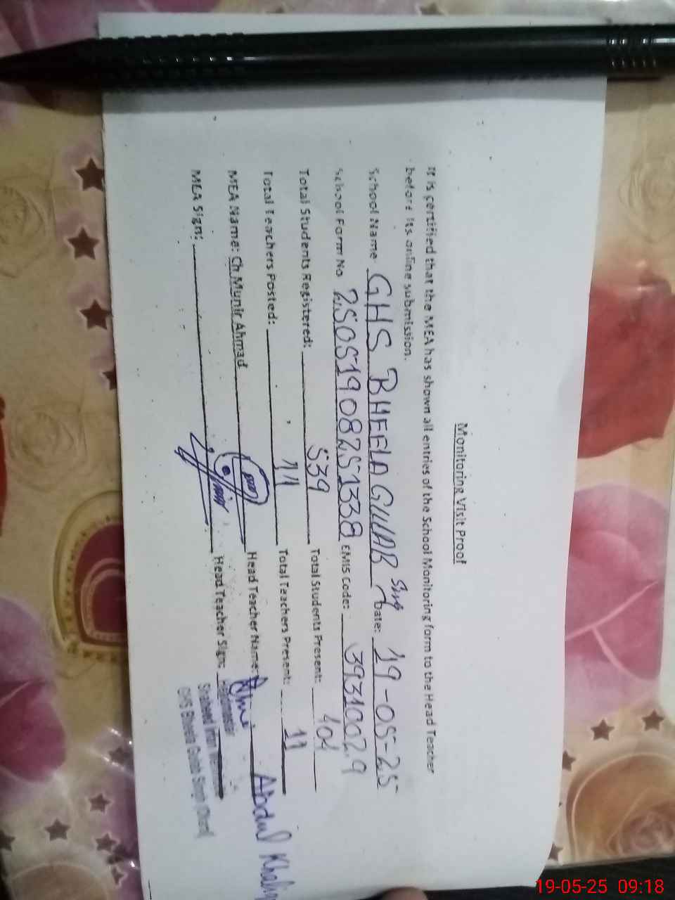 | Certified that this School was Inspected by the Undersigned MEA/DMO Today and the Information Stated Above is as Per Record. | |||||