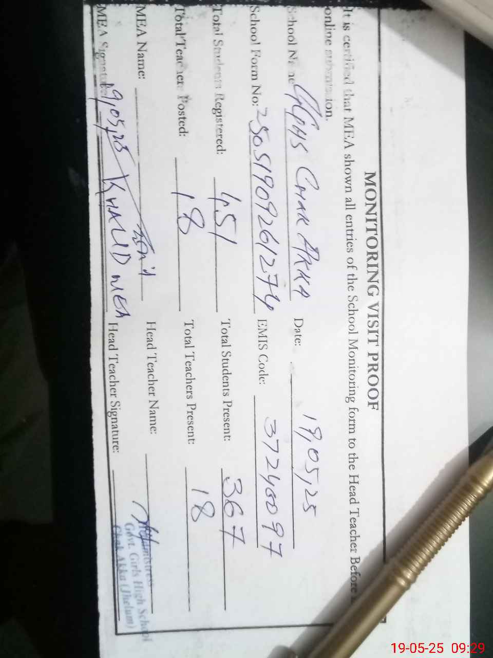 | Attendance Register | Head Teacher | MEA with School | Visit Proof |