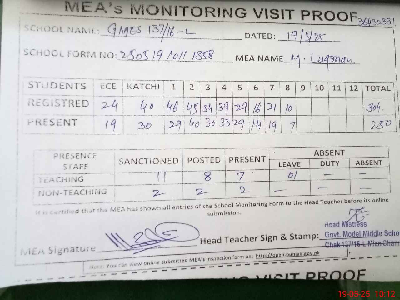 | Certified that this School was Inspected by the Undersigned MEA/DMO Today and the Information Stated Above is as Per Record. | |||||