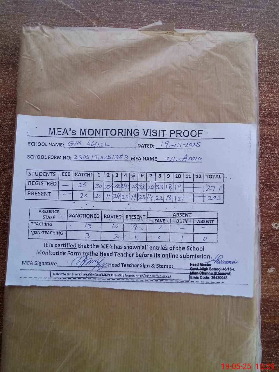 | Certified that this School was Inspected by the Undersigned MEA/DMO Today and the Information Stated Above is as Per Record. | |||||