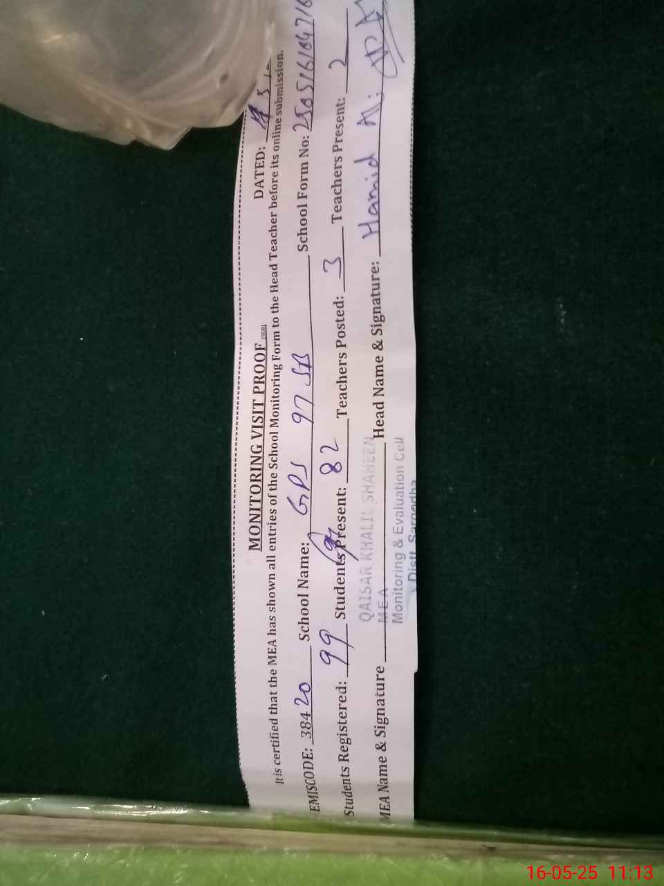 | Attendance Register | Head Teacher | MEA with School | Visit Proof |