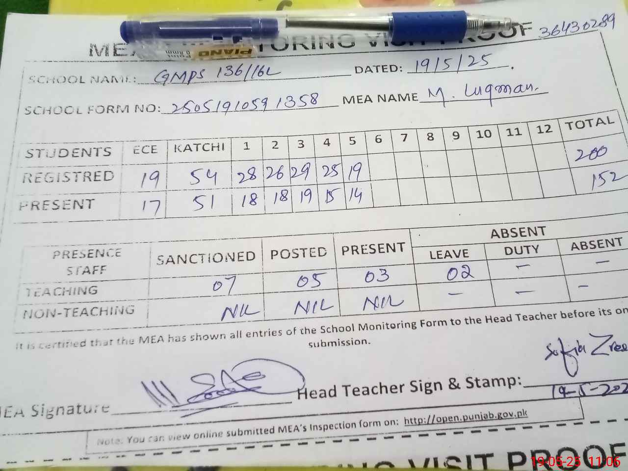 | Certified that this School was Inspected by the Undersigned MEA/DMO Today and the Information Stated Above is as Per Record. | |||||