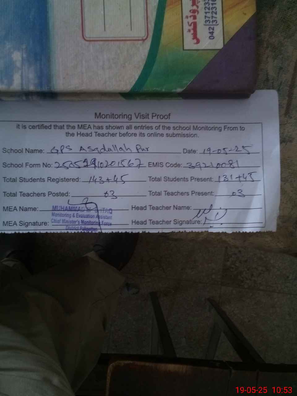 | Attendance Register | Head Teacher | MEA with School | Visit Proof |