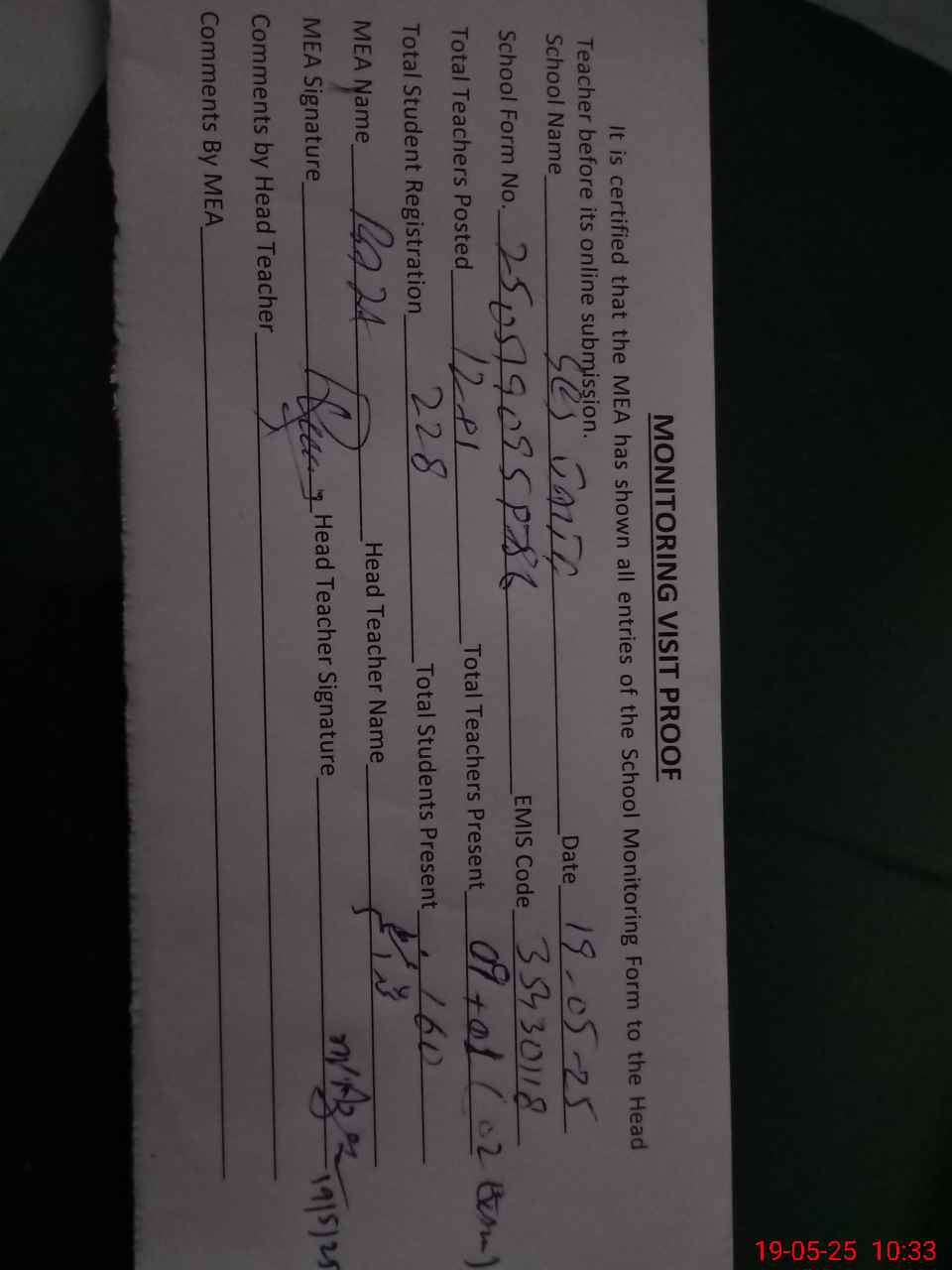 | Attendance Register | Head Teacher | MEA with School | Visit Proof |