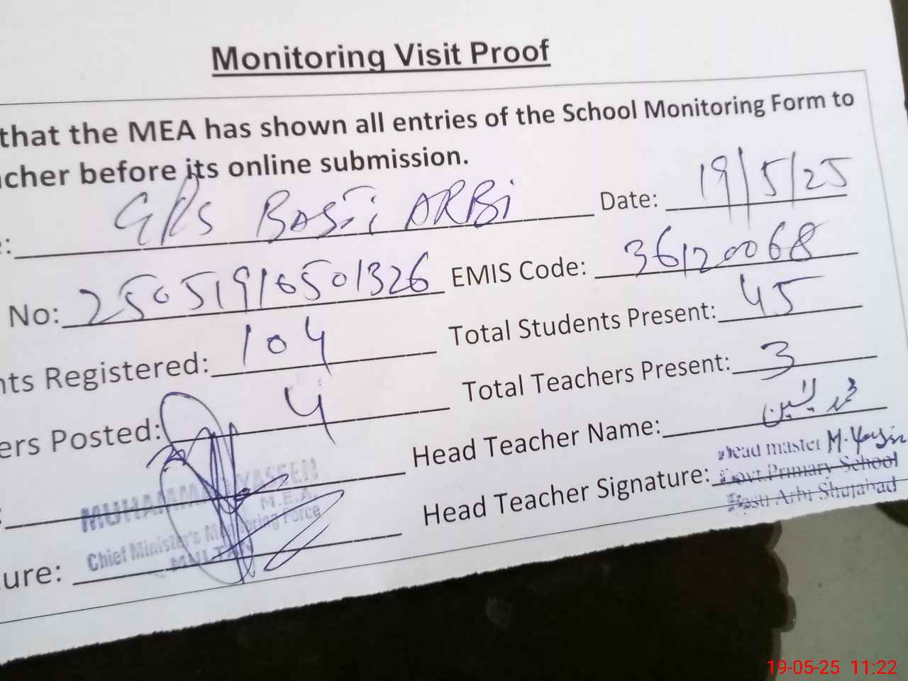 | Certified that this School was Inspected by the Undersigned MEA/DMO Today and the Information Stated Above is as Per Record. | |||||