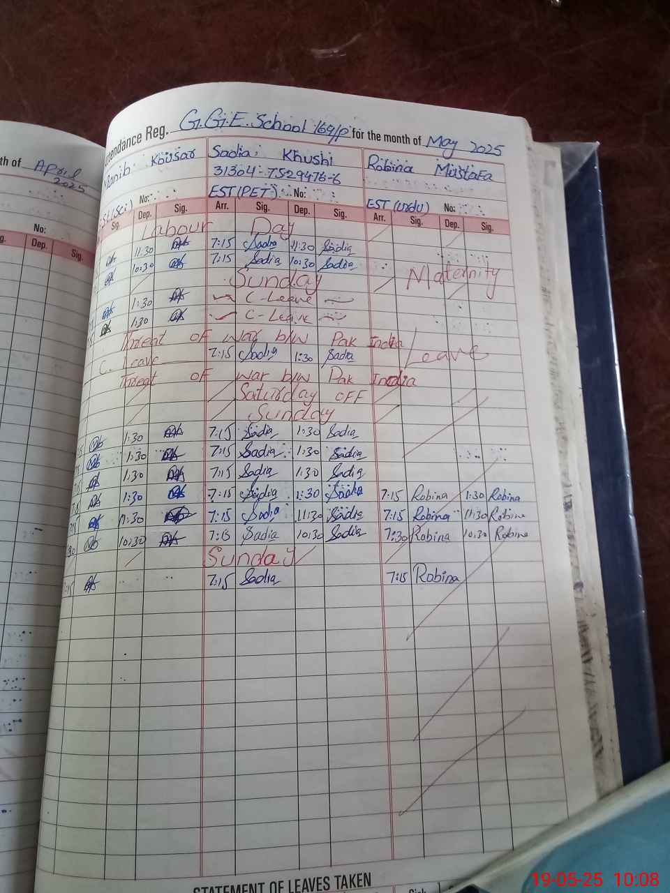 | Leave | Duty | Absent | Maternity | Medical | Ex- Pak |