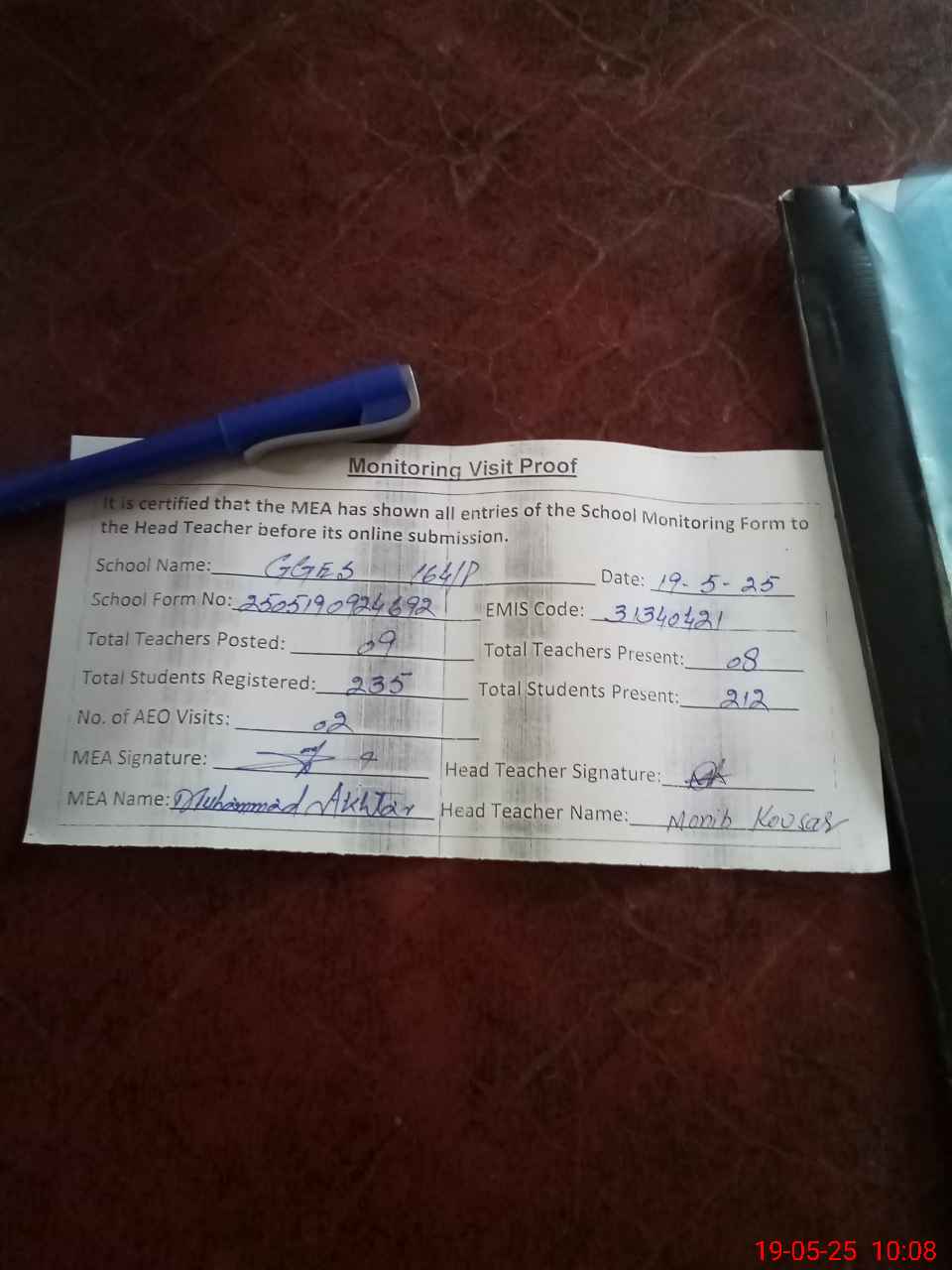 | Attendance Register | Head Teacher | MEA with School | Visit Proof |