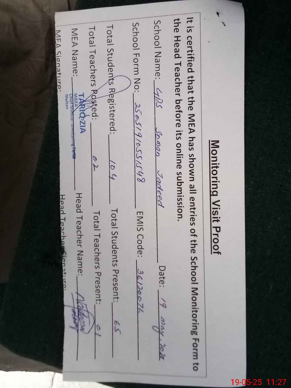 | Attendance Register | Head Teacher | MEA with School | Visit Proof |