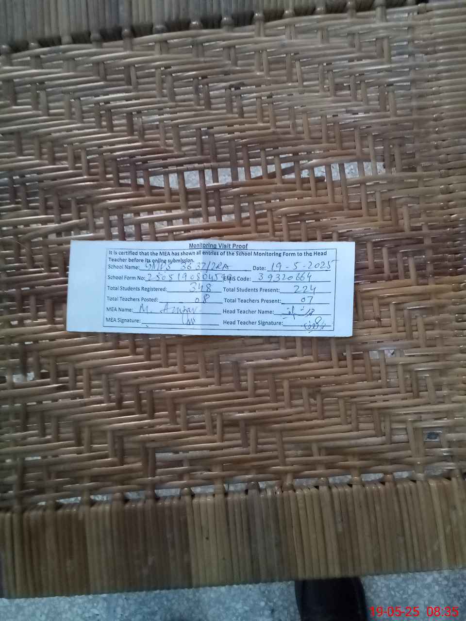 | Certified that this School was Inspected by the Undersigned MEA/DMO Today and the Information Stated Above is as Per Record. | |||||