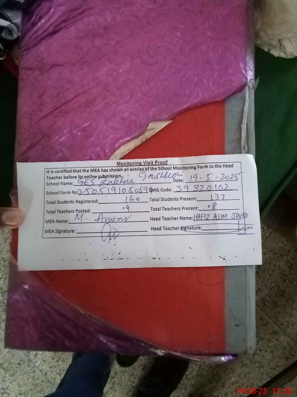 | Attendance Register | Head Teacher | MEA with School | Visit Proof |