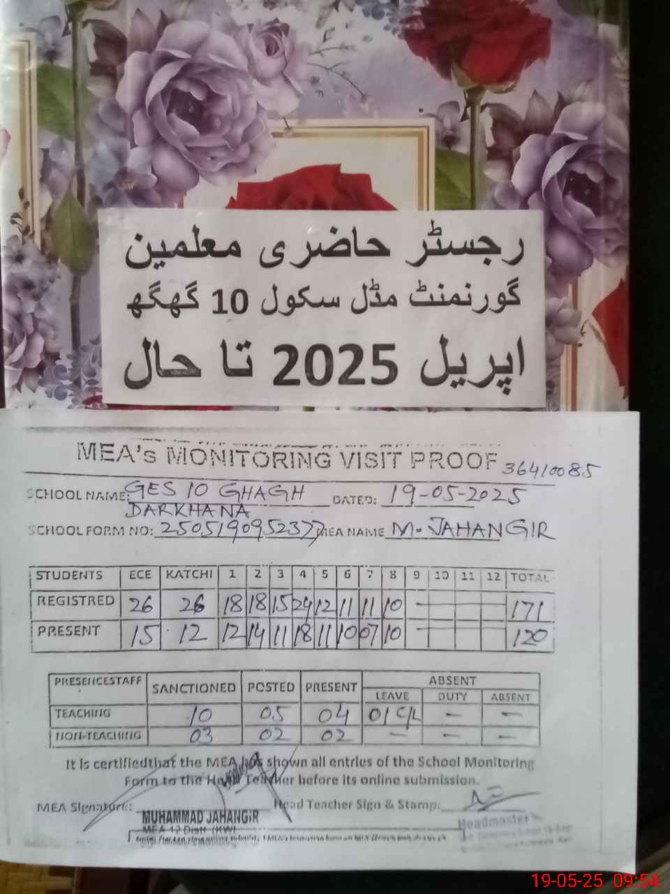 | Attendance Register | Head Teacher | MEA with School | Visit Proof |
