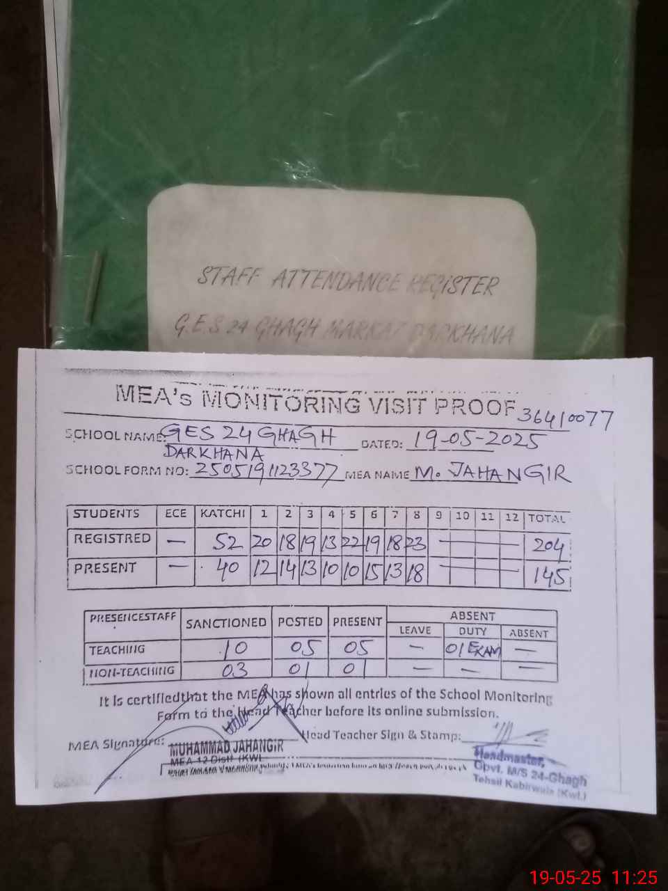 | Attendance Register | Head Teacher | MEA with School | Visit Proof |