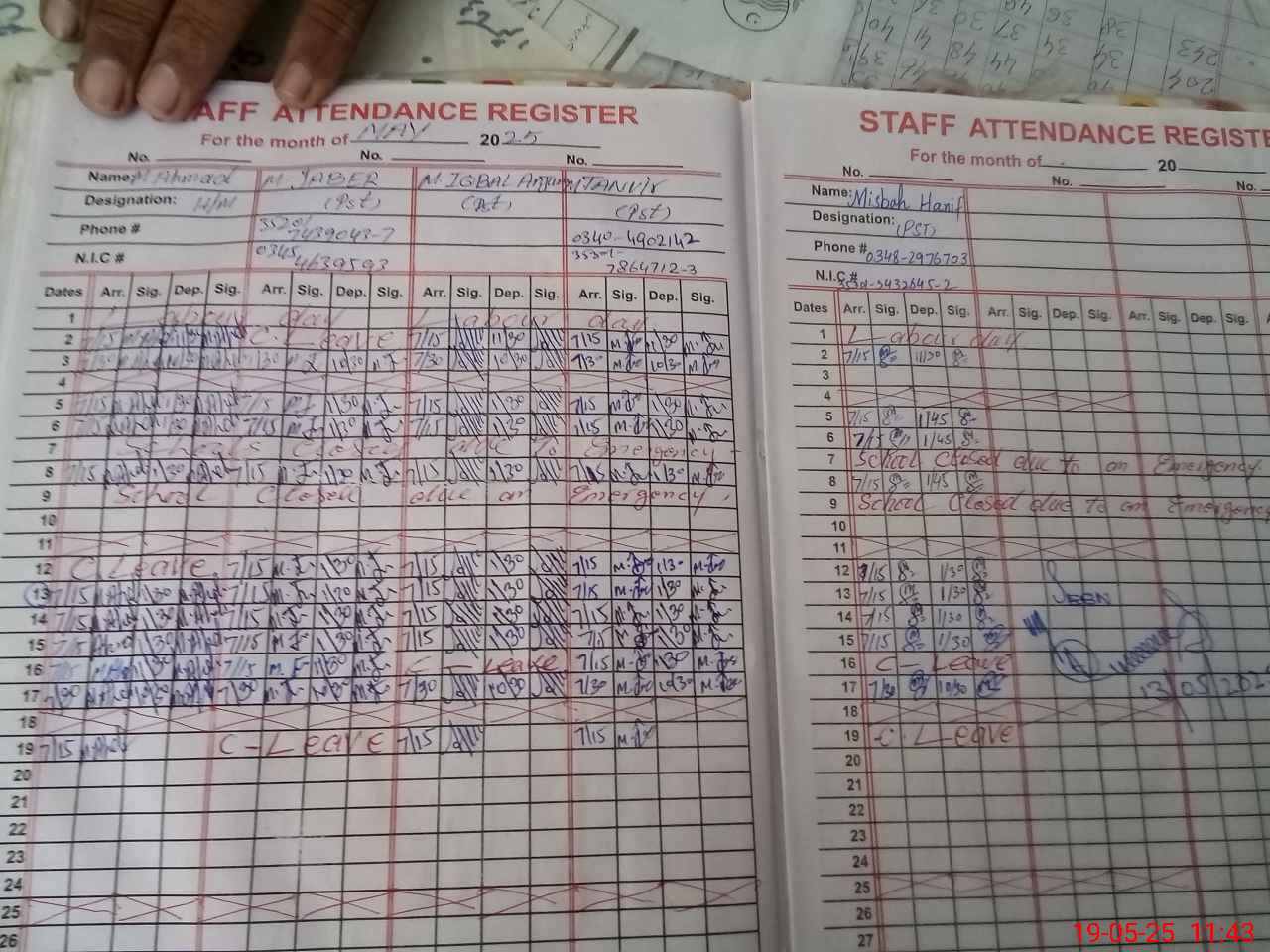 | CNIC | Full Name | Designation | R/C | Absence during last cal. month |