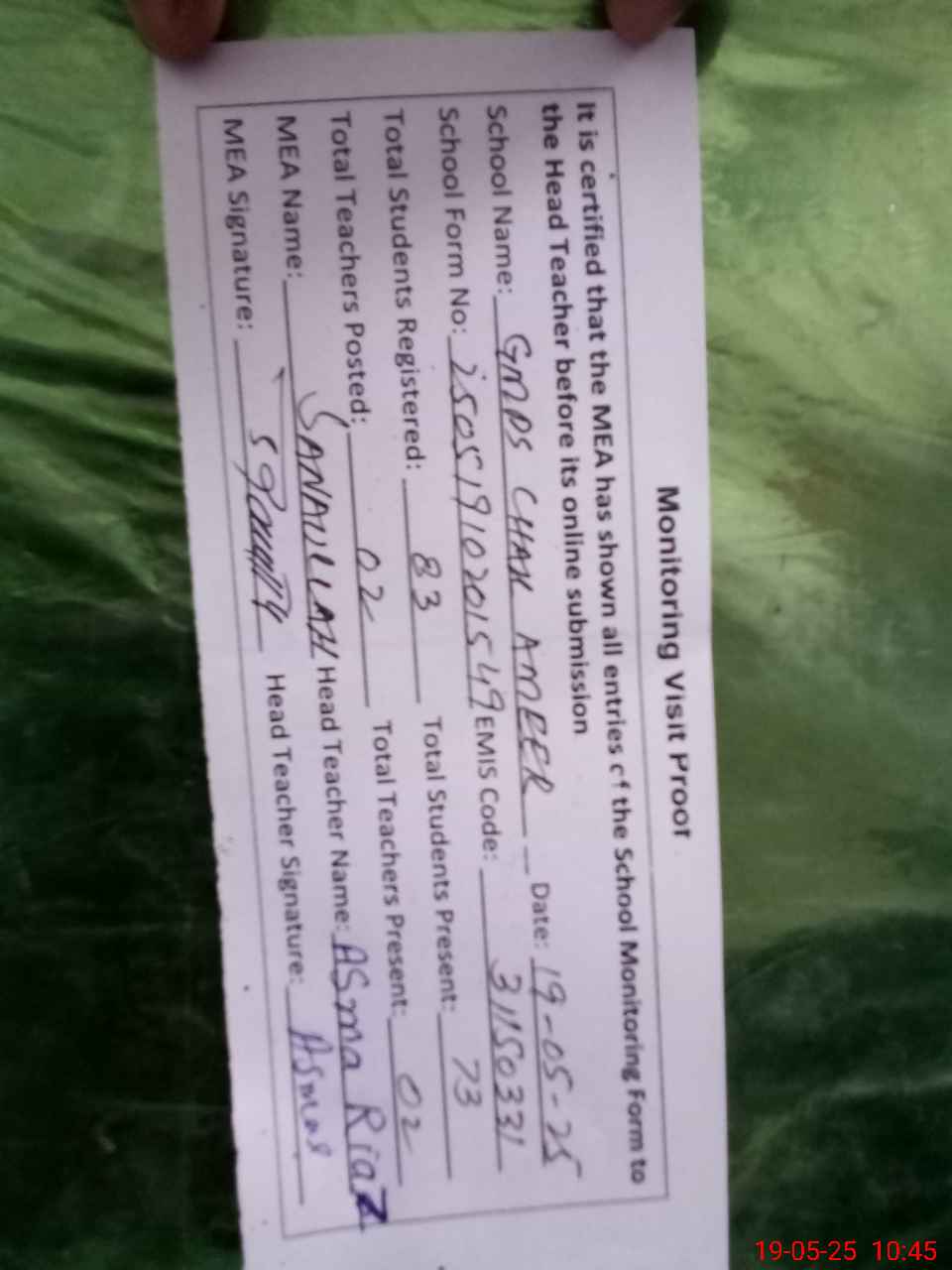 | Attendance Register | Head Teacher | MEA with School | Visit Proof |