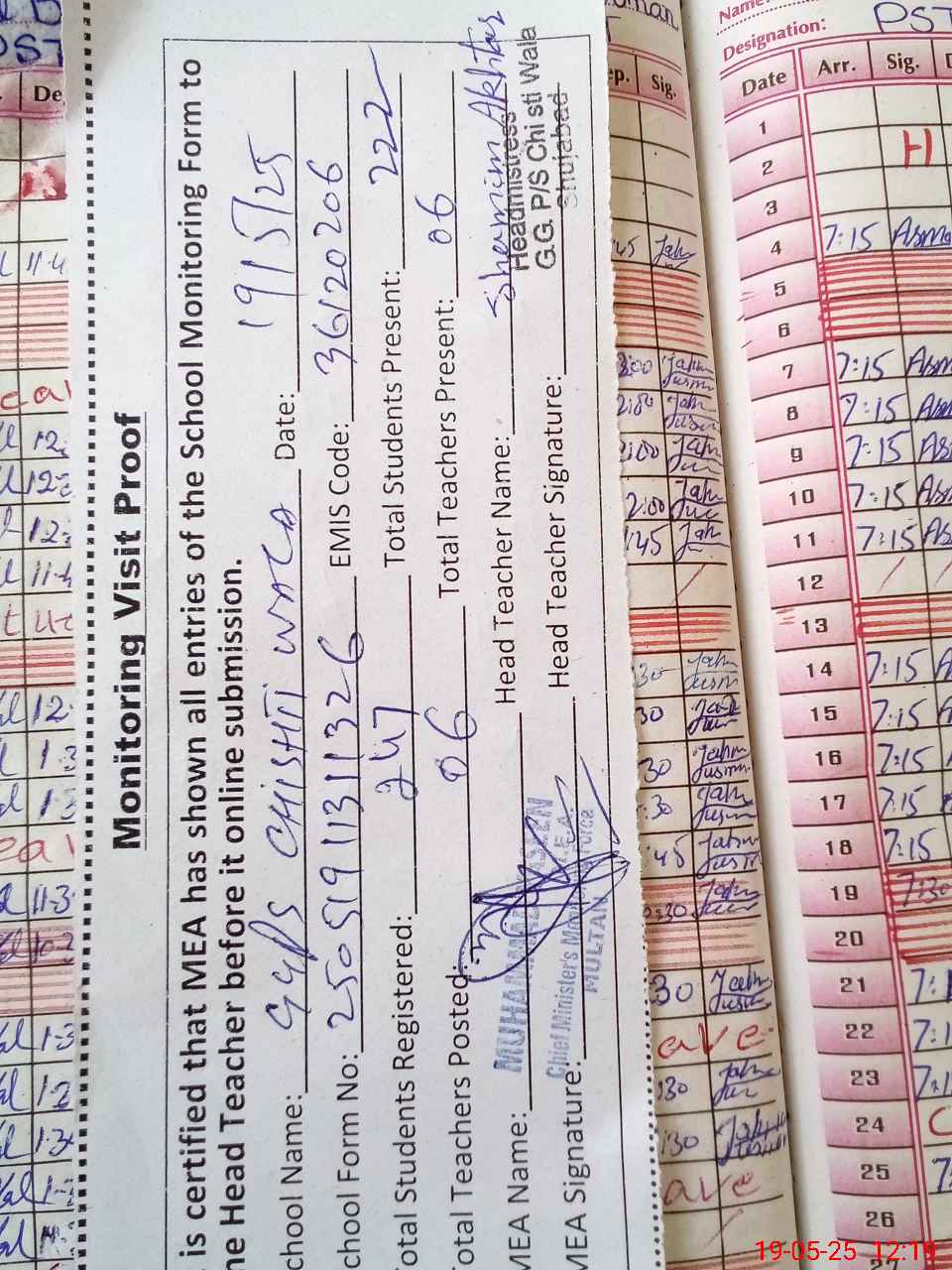 | Attendance Register | Head Teacher | MEA with School | Visit Proof |