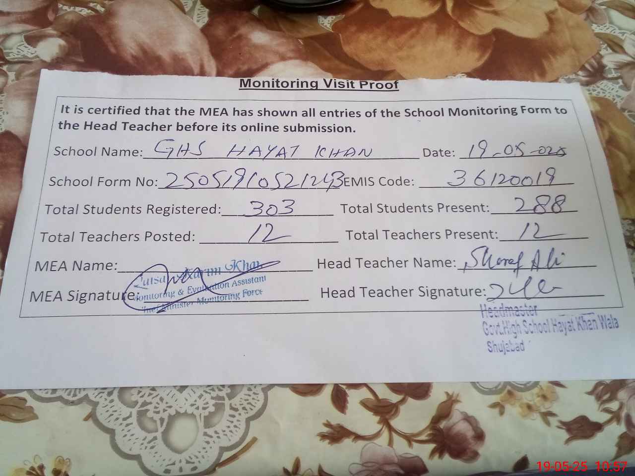 | Attendance Register | Head Teacher | MEA with School | Visit Proof |