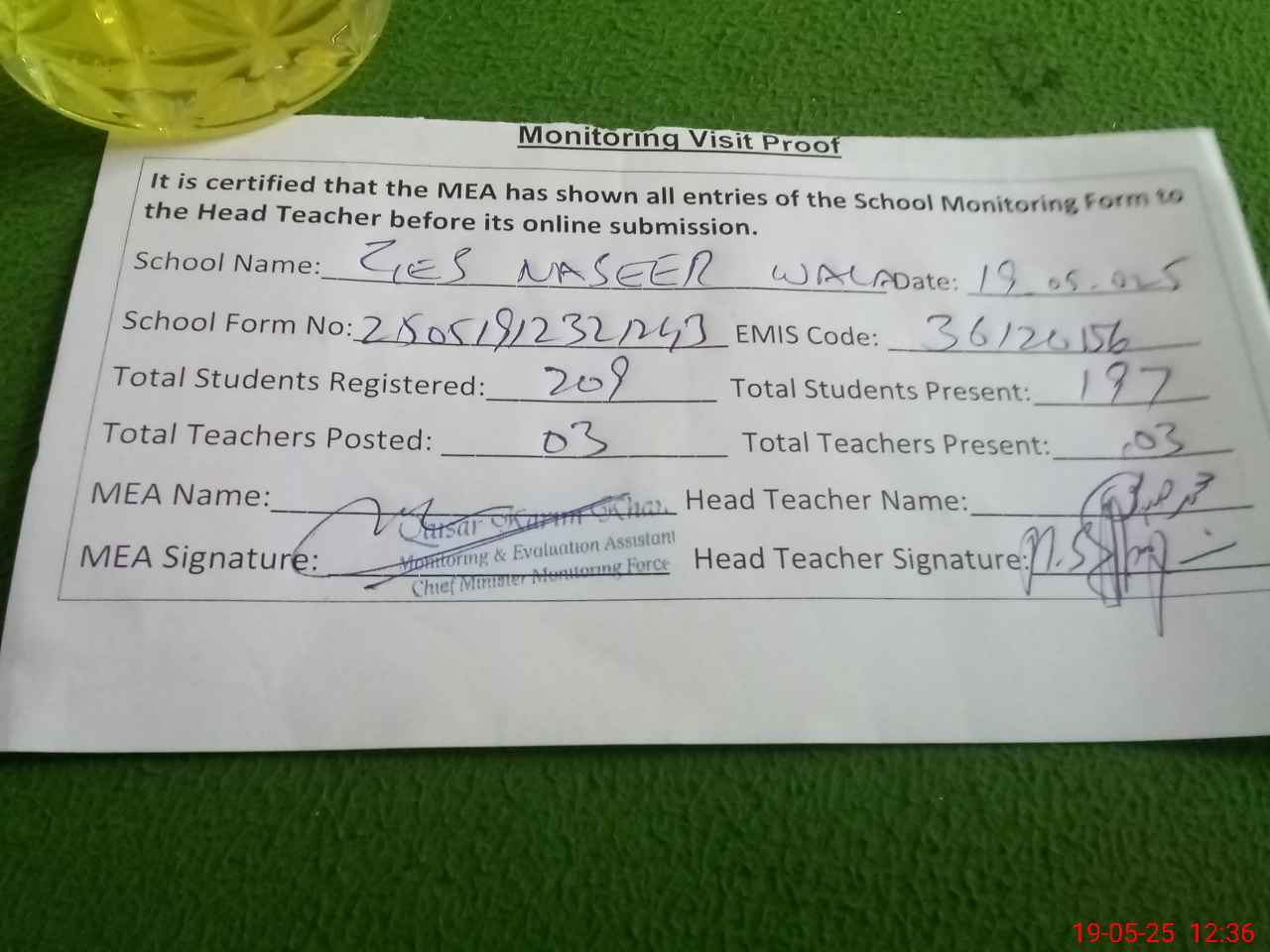 | Attendance Register | Head Teacher | MEA with School | Visit Proof |