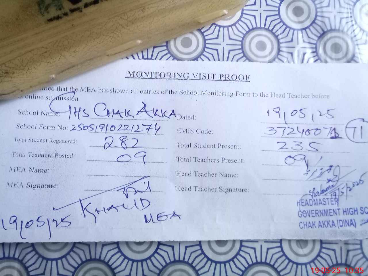 | Certified that this School was Inspected by the Undersigned MEA/DMO Today and the Information Stated Above is as Per Record. | |||||