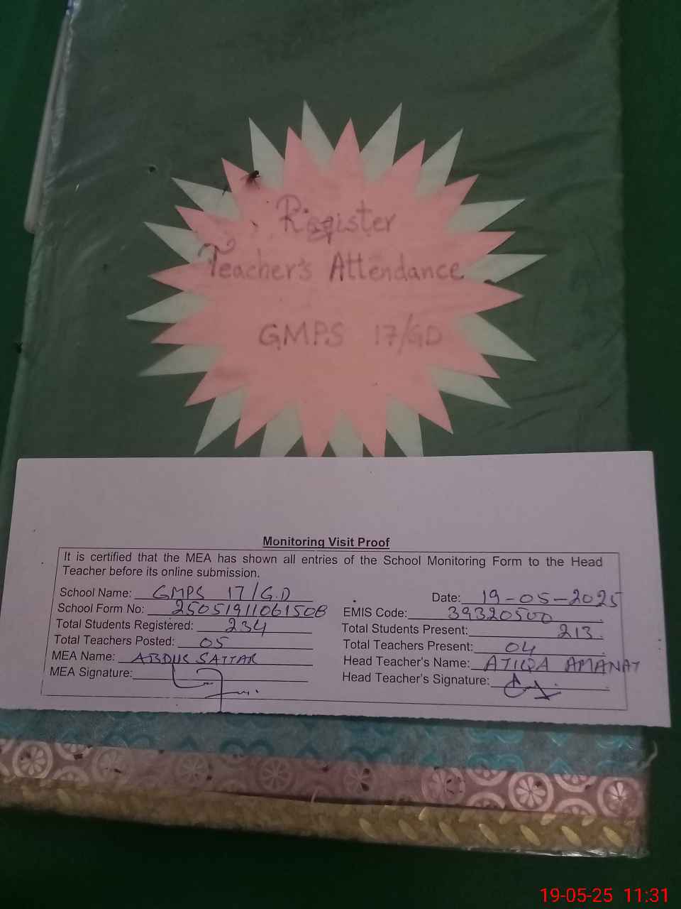 | Attendance Register | Head Teacher | MEA with School | Visit Proof |