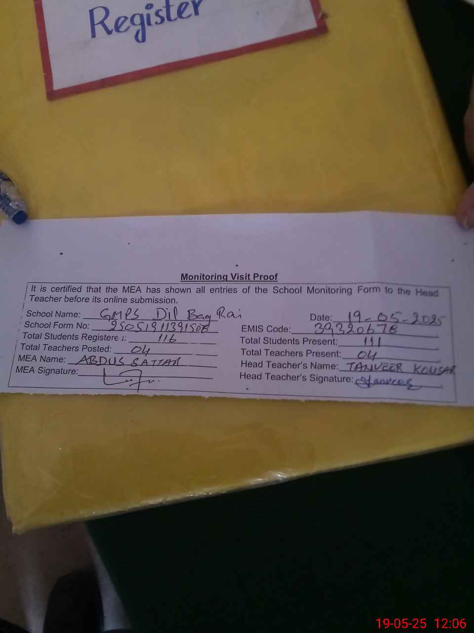 | Attendance Register | Head Teacher | MEA with School | Visit Proof |