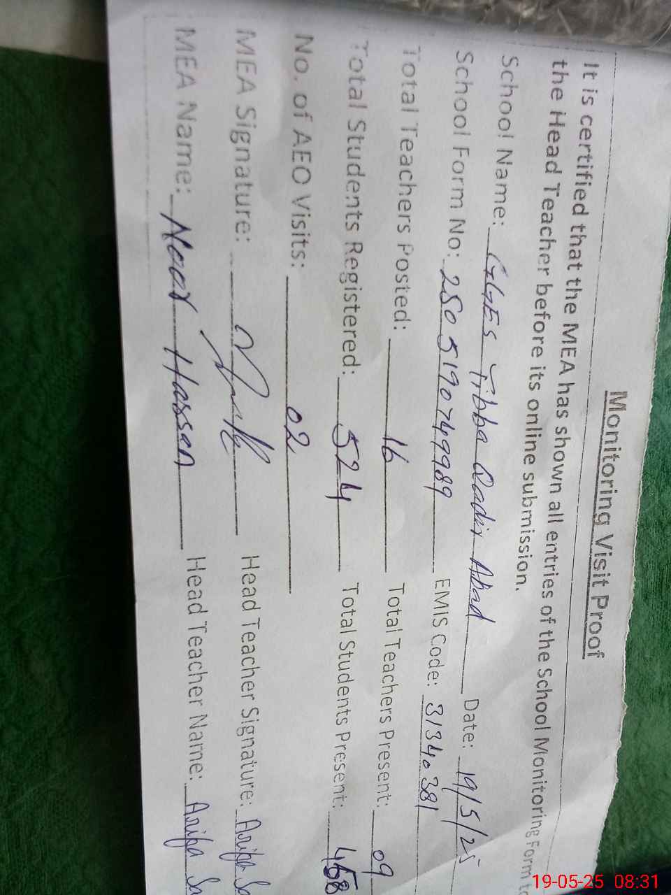 | Certified that this School was Inspected by the Undersigned MEA/DMO Today and the Information Stated Above is as Per Record. | |||||