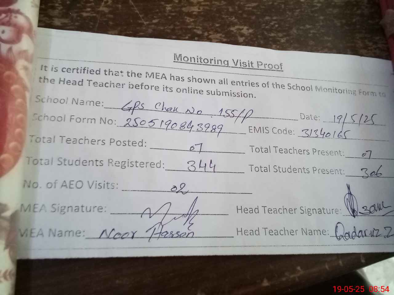 | Attendance Register | Head Teacher | MEA with School | Visit Proof |