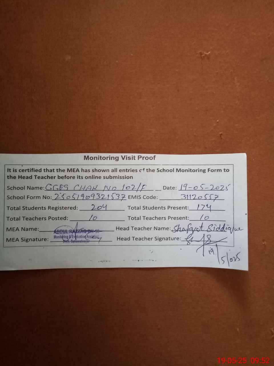 | EMIS Code: 31120557 | Name of School: GGES CHAK NO 102/F | |||