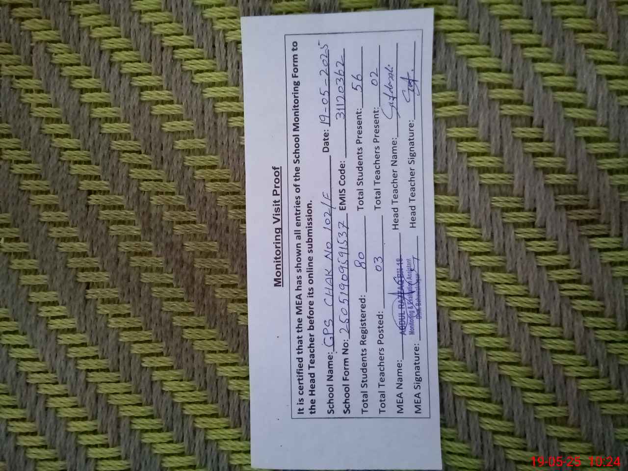 | EMIS Code: 31120362 | Name of School: GPS CHAK NO 102 F | |||