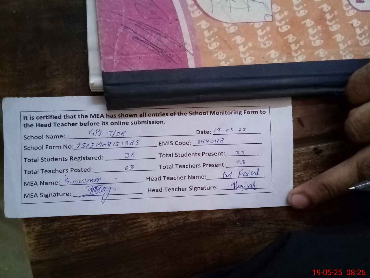 | Attendance Register | Head Teacher | MEA with School | Visit Proof |