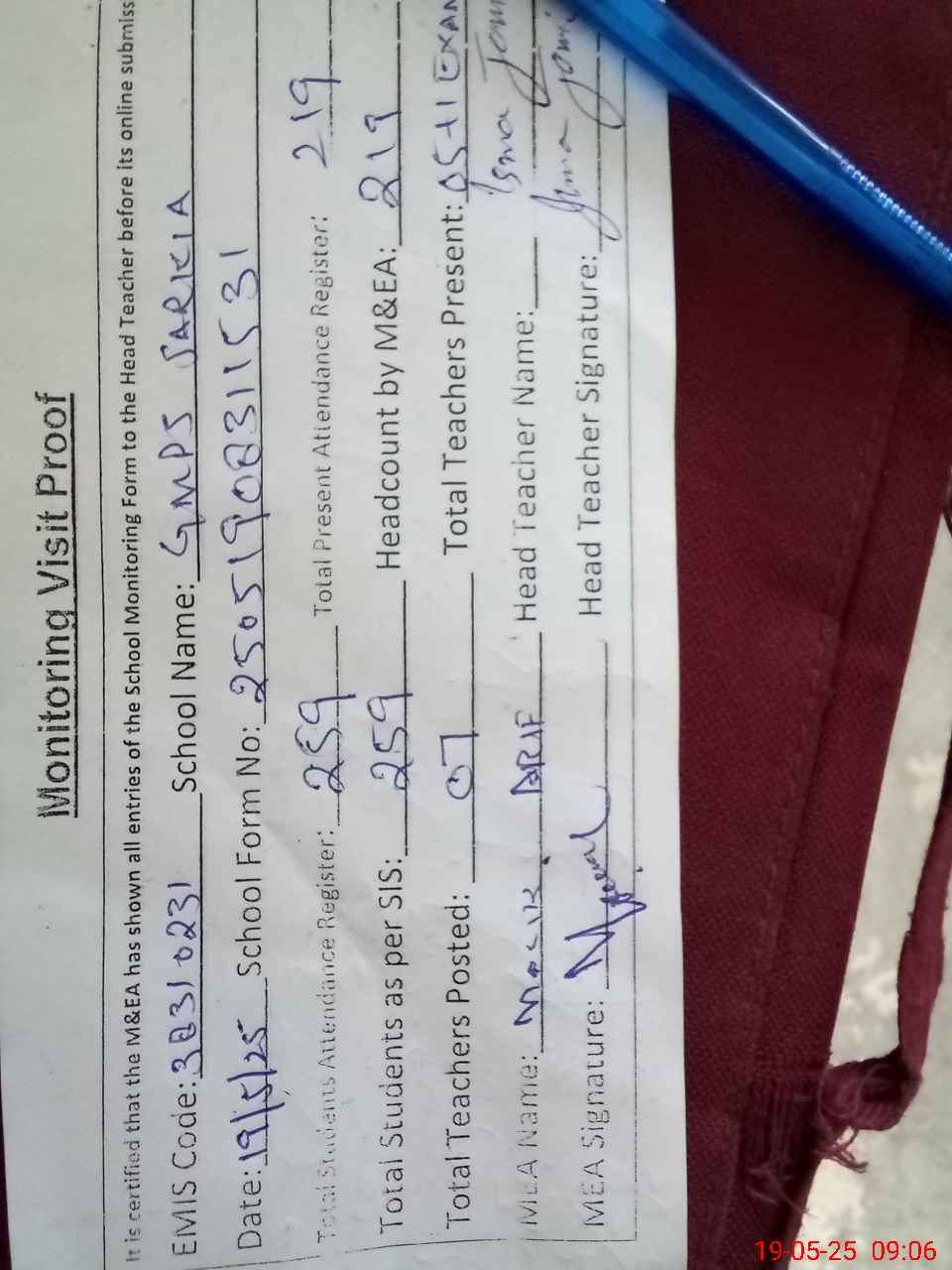 | Attendance Register | Head Teacher | MEA with School | Visit Proof |