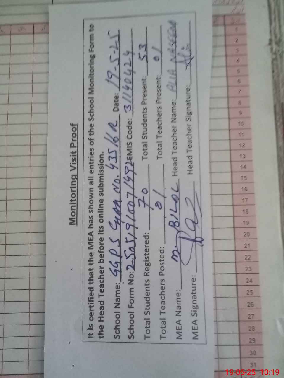 | Attendance Register | Head Teacher | MEA with School | Visit Proof |