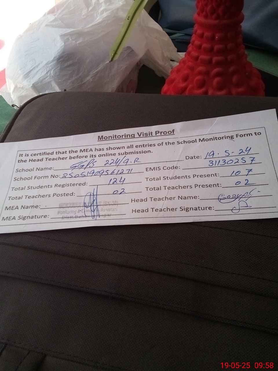 | Attendance Register | Head Teacher | MEA with School | Visit Proof |
