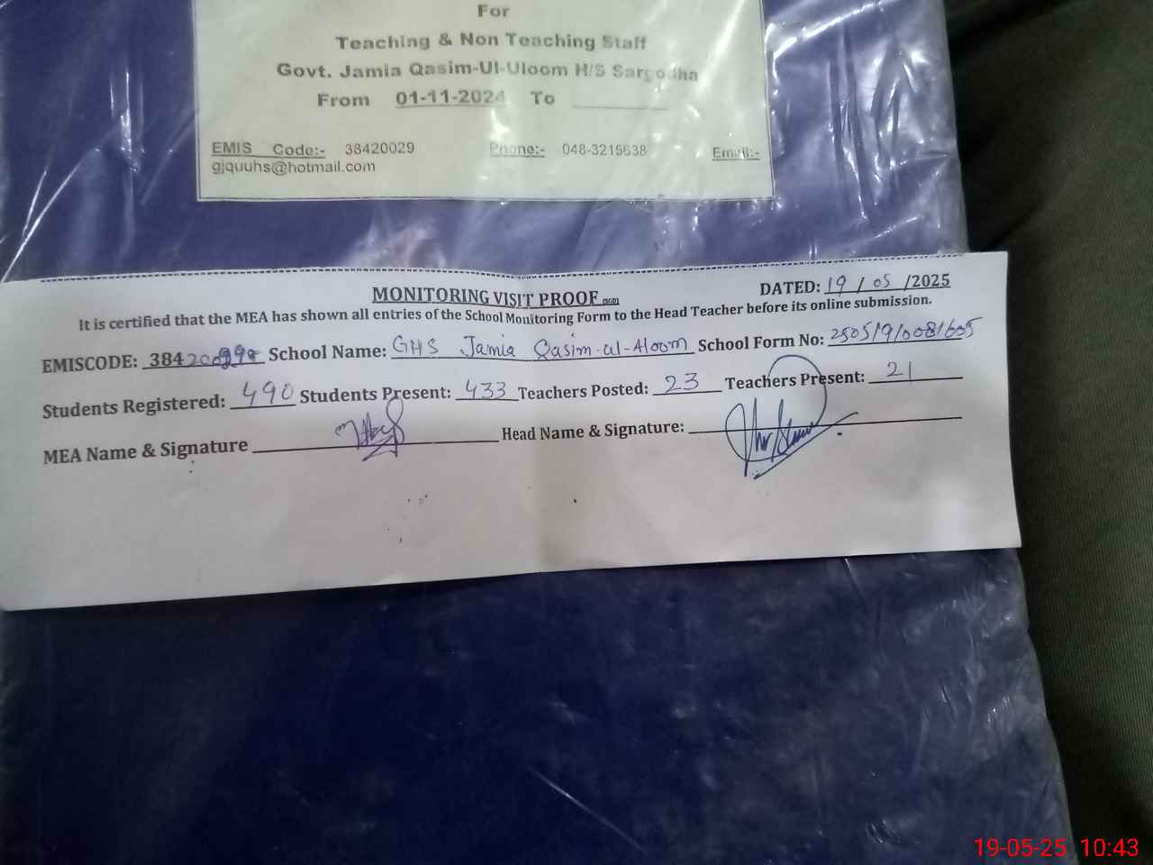| EMIS Code: 38420029 | Name of School: GHS JAMIA QASIM UL ULOOM JINNAH COLONY | |||