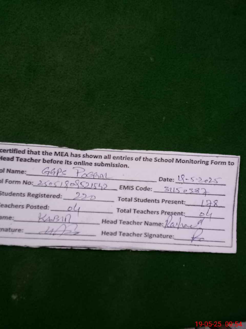 | Attendance Register | Head Teacher | MEA with School | Visit Proof |