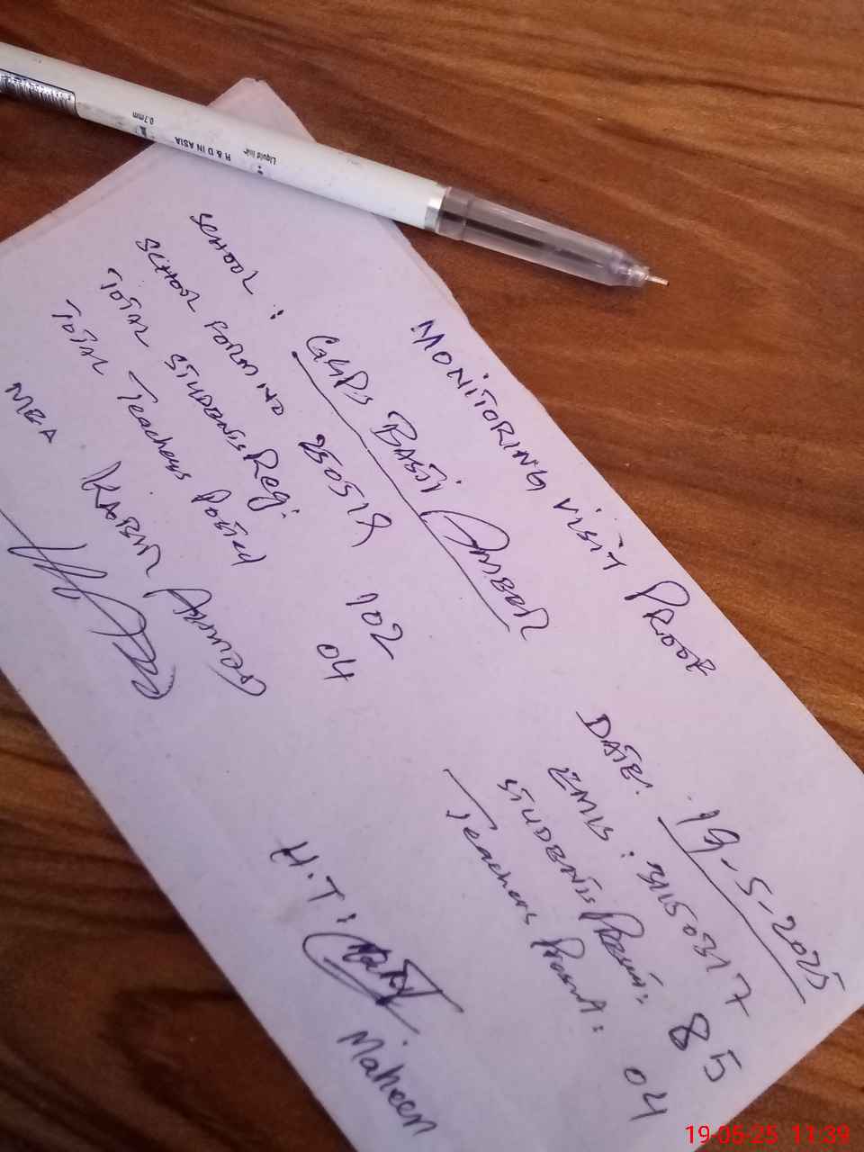| Attendance Register | Head Teacher | MEA with School | Visit Proof |