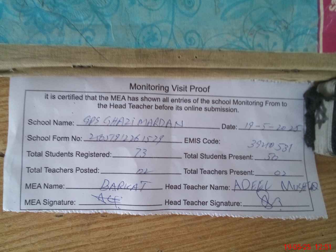 | EMIS Code: 39210531 | Name of School: GPS GHAZI MARDAN P/O CHAK BEDI | |||