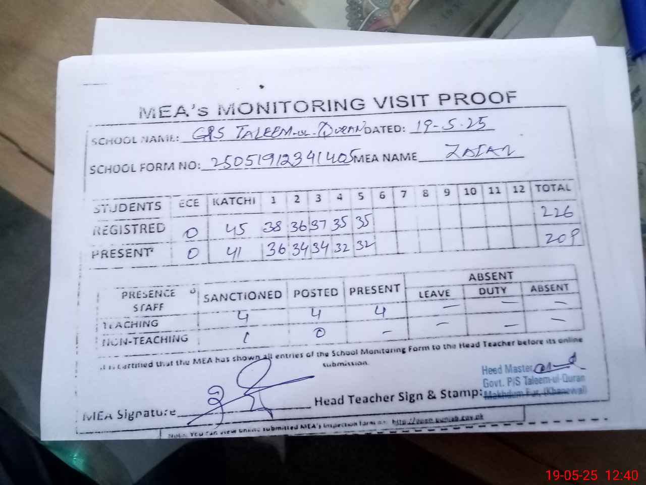 | Attendance Register | Head Teacher | MEA with School | Visit Proof |