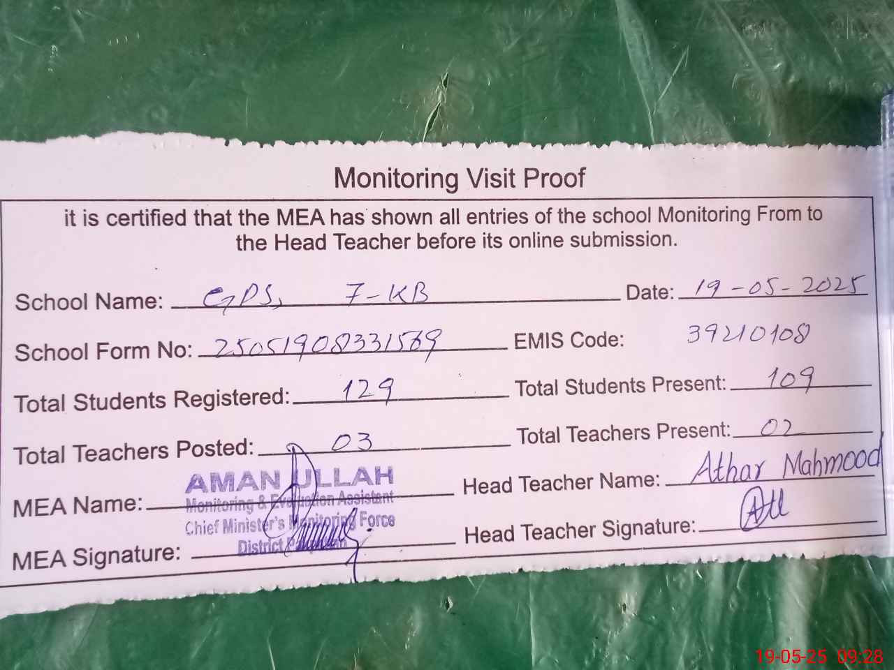 | Attendance Register | Head Teacher | MEA with School | Visit Proof |