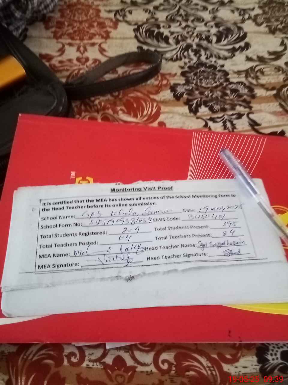 | Attendance Register | Head Teacher | MEA with School | Visit Proof |
