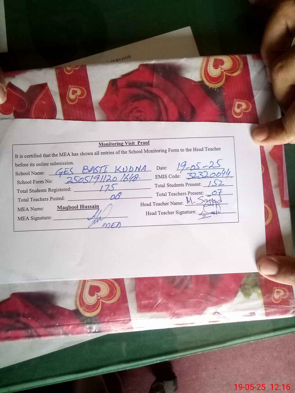 | Attendance Register | Head Teacher | MEA with School | Visit Proof |