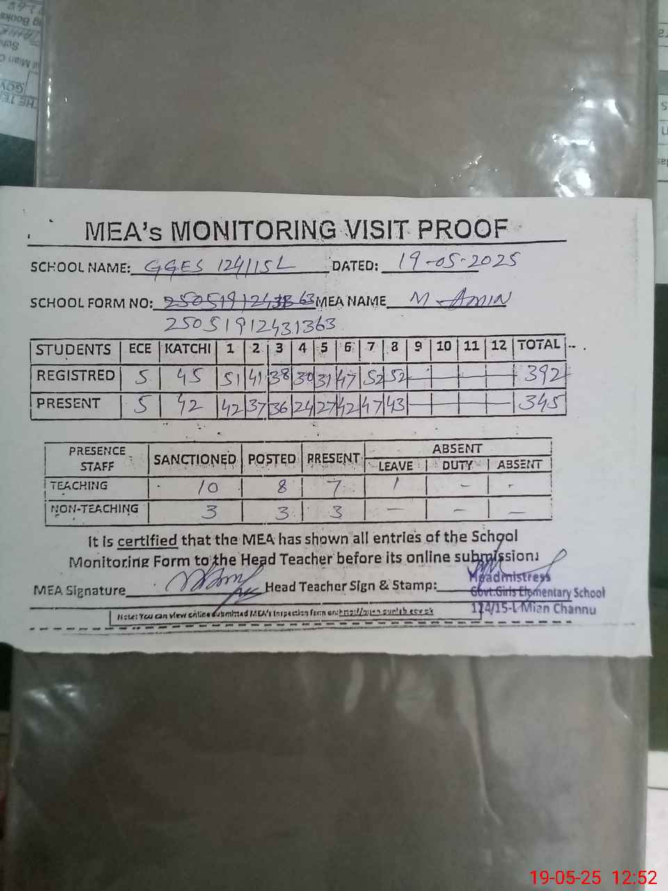| Attendance Register | Head Teacher | MEA with School | Visit Proof |