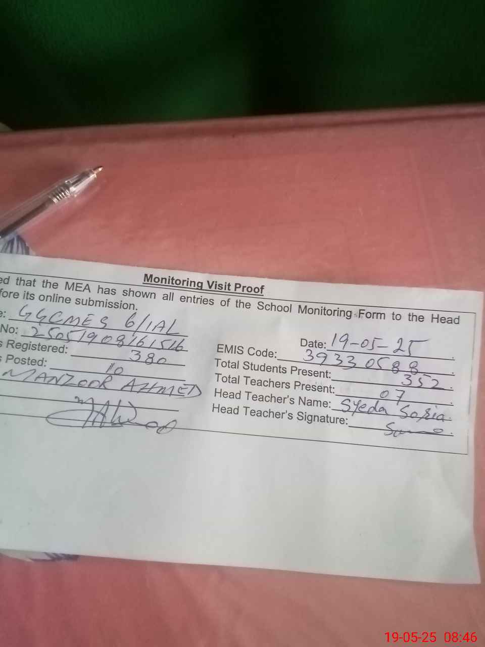 | Certified that this School was Inspected by the Undersigned MEA/DMO Today and the Information Stated Above is as Per Record. | |||||
