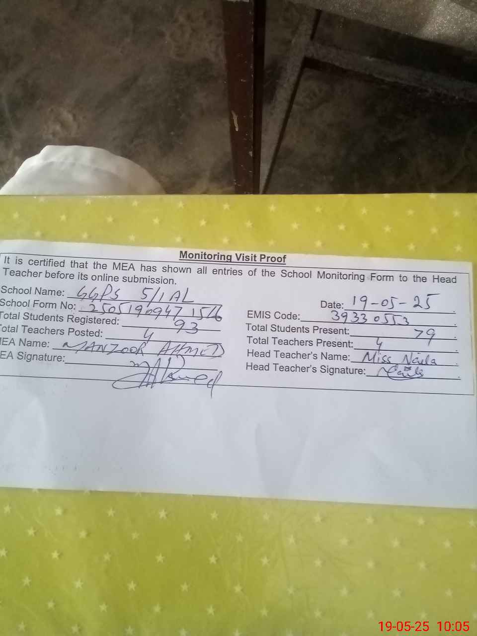 | Attendance Register | Head Teacher | MEA with School | Visit Proof |