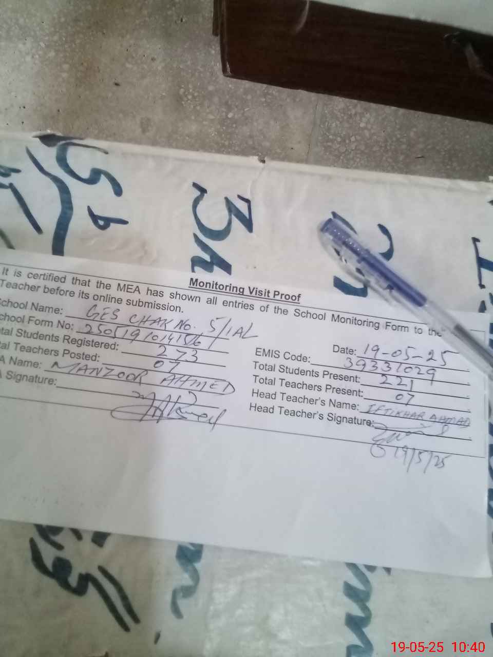 | Certified that this School was Inspected by the Undersigned MEA/DMO Today and the Information Stated Above is as Per Record. | |||||