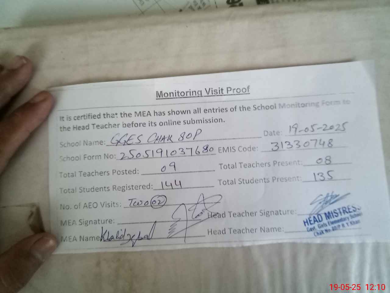 | Attendance Register | Head Teacher | MEA with School | Visit Proof |