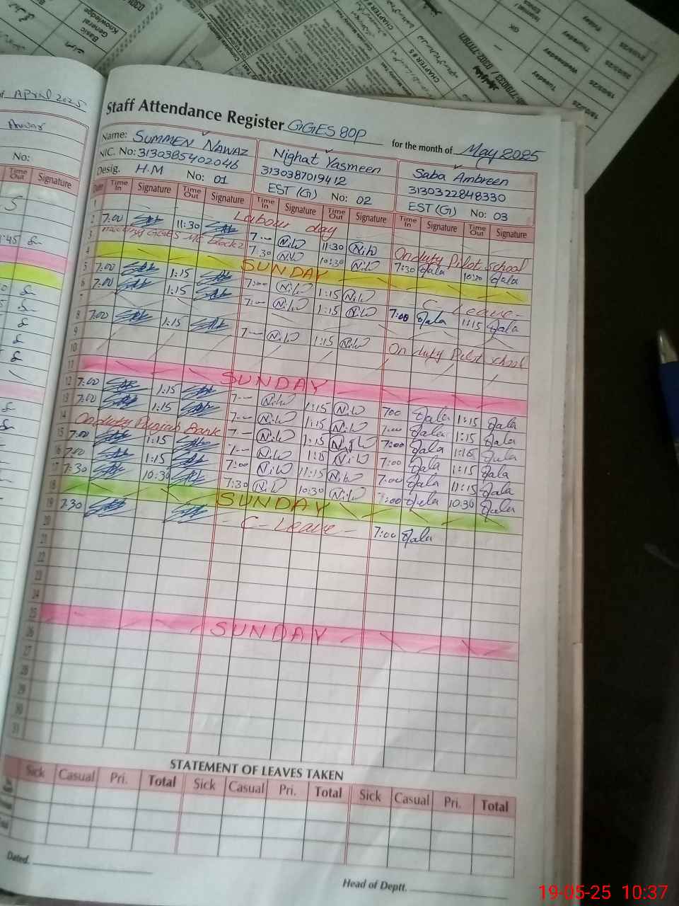 | CNIC | Full Name | Designation | R/C | Absence During Last Calender Month |