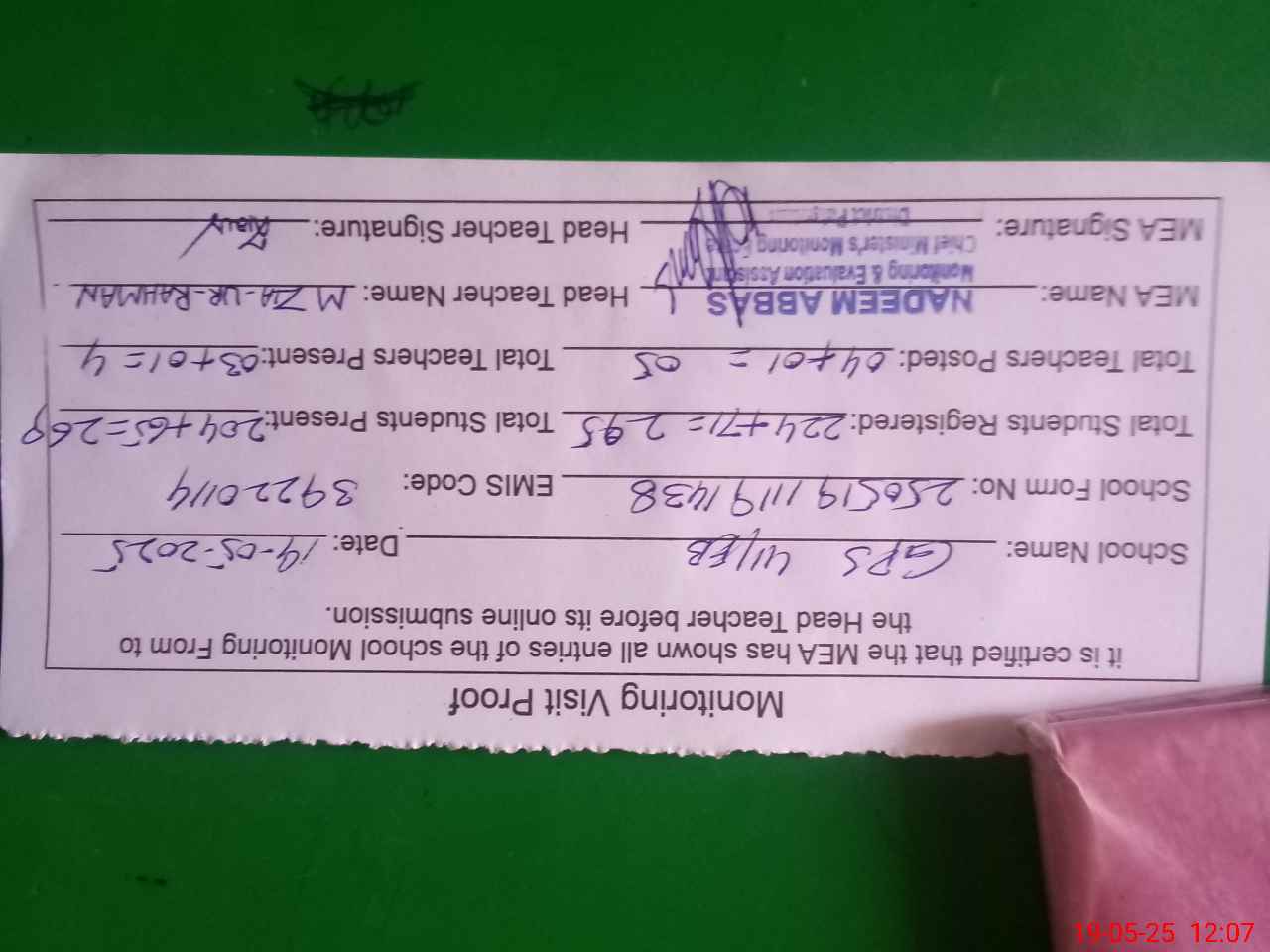 | Certified that this School was Inspected by the Undersigned MEA/DMO Today and the Information Stated Above is as Per Record. | |||||