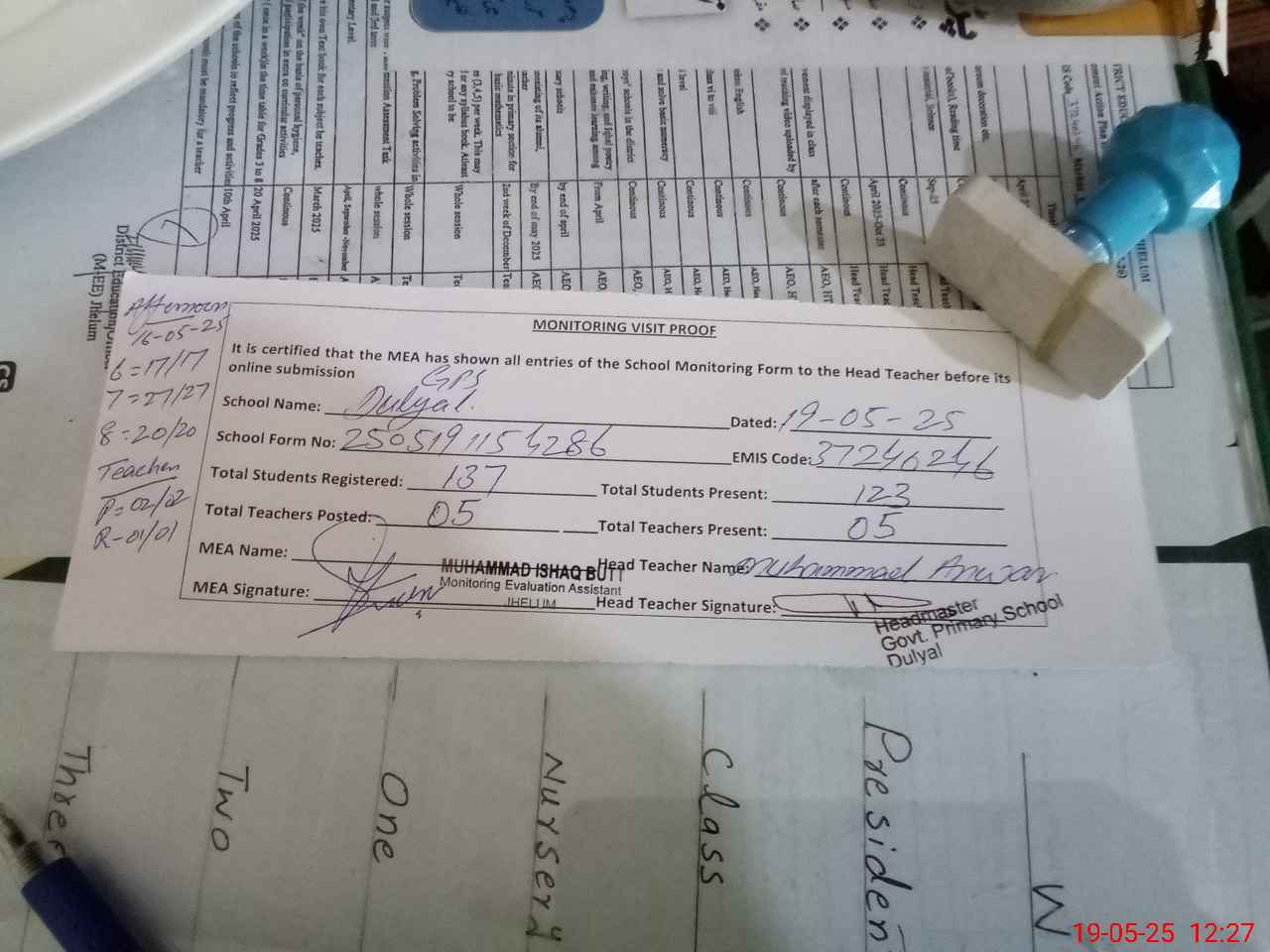 | Attendance Register | Head Teacher | MEA with School | Visit Proof |