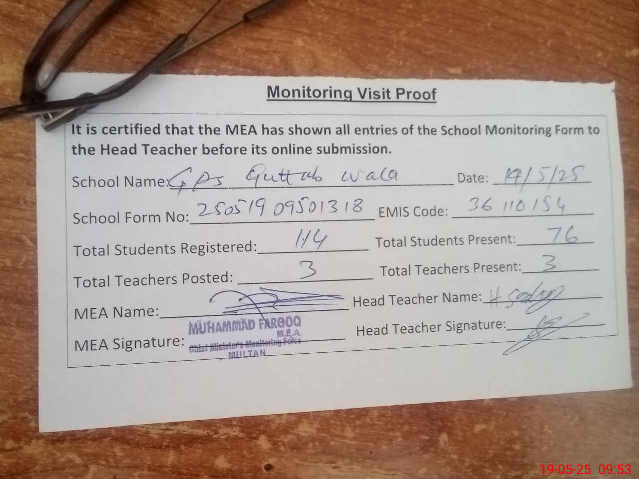 | EMIS Code: 36110154 | Name of School: GPS QUTTUB WALA ISMAIL ABAD P/O MULTAN | |||