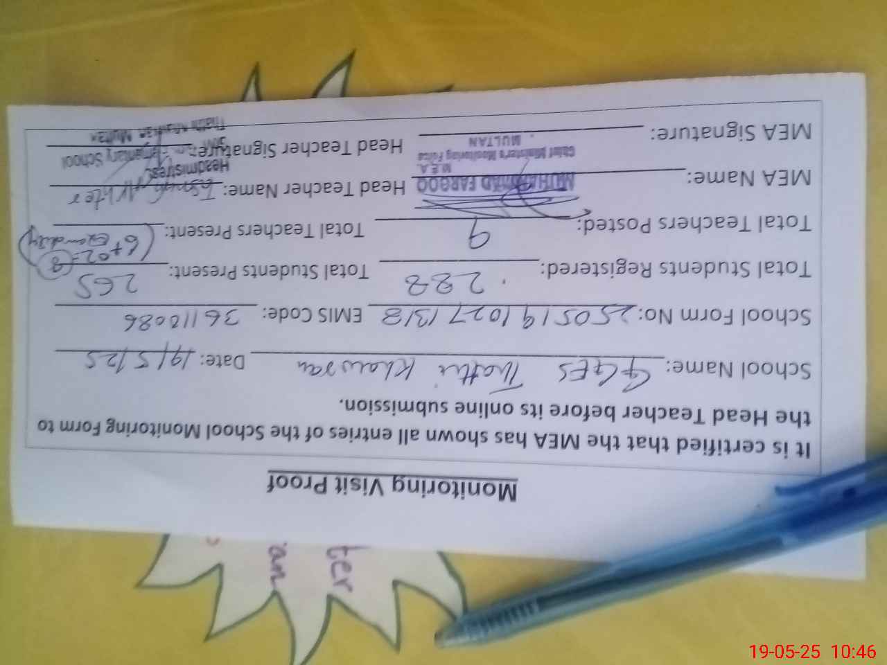 | Certified that this School was Inspected by the Undersigned MEA/DMO Today and the Information Stated Above is as Per Record. | |||||